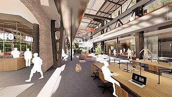 "Hall 70 looks like the LocHal" says Joost Ector on behalf of the Rotterdam architectural firm. "Yet the atmosphere there will be different. The hall is narrower and higher, the light falls in differently." This part of MindLabs will have a flat floor with a circulation on the second floor. "We try to make a one-piece space as much as possible. The use of materials is also different than in the LocHal."